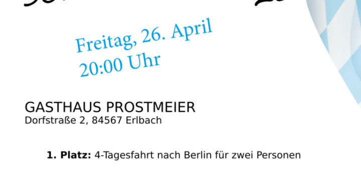 24. April 2019 Schafkopfrennen 2019 Wann: 26. April 2019 um 20:00 Wo: Gasthaus Prostmaier , Dorfstraße 2, 84567 Erlbach